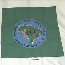 BANDEIRA EM TECIDO VERDE (77,5X73 CM). NA FRENTE, CÍRCULO AZUL COM O MAPA DO BRASIL INSCRITO, E DESENHO ESTEREOTIPADO DE UMA PESSOA PUXANDO UMA CARROÇA. POSSUI A INSCRIÇÃO 'MOVIMENTO NACIONAL DOS CATADORES DE MATERIAIS RECICLÁVEIS'.