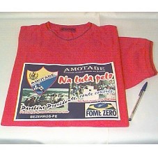 CAMISA (TAM GG) VERMELHA, DE MANGA CURTA, COM DETALHES AZUIS NA GOLA E NAS MANGAS. NA FRENTE, ESTAMPA COM FOTOS E 'AMOTABE / ASSOCIAÇÃO DOS MOTO-TAXISTAS DOS BEZERROS / NA LUTA PELO FOME ZERO / PARABÉNS PRESIDENTE, CONTE CONOSCO.'.