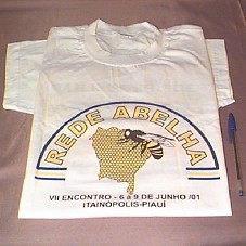 DUAS CAMISETAS (TAM M) EM MALHA BRANCA, DE MANGA CURTA. NA FRENTE, ESTAMPA COM FAVO DE MEL E ABELHA E 'REDE ABELHA / VII ENCONTRO - 6 A 9 DE JUNHO/01 / ITAINÓPOLIS -PIAUÍ'. ATRÁS, 'MEL DE ABELHAS / ITAIMEL / COMPAI / ENTREPOSTO DE MEL E CERA DE ABELHAS / ITAINÓPÓLIS - PIAUÍ - FONE: (86) 446-1289'.