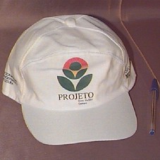 BONÉ EM TECIDO BRANCO. NA FRENTE, ESTAMPA ESTILIZADA DE UMA FLOR E 'PROJETO DOM HELDER CAMARA'. NA LATERAL, 'FIDA / FUNDO INTERNACIONAL PARA O DESENVOLVIMENTO DA AGRICULTURA'.