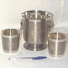 BALDE DE GELO (12,4X14,4 CM) EM ESTANHO, COM BORDAS E INTERIOR POLIDOS. POSSUI BRASÃO DO EXÉRCITO BRASILEIRO GRAVADO NA PARTE FRONTAL, E 'EXÉRCITO BRASILEIRO 1648'. NAS LATERAIS, DUAS ALÇAS EM ARGOLAS COM DETALHES EM CABEÇA DE LEÃO. NO FUNDO DA BASE, INSCRIÇÃO 'JOHN SOMERS / A2F / BRAZIL'. ACOMPANHA DOIS COPOS EM MESMO MATERIAL E COM MESMAS GRAVAÇÕES. ACONDICIONADOS EM CAIXA FORRADA DE TECIDO PRETO (37X21X15 CM).