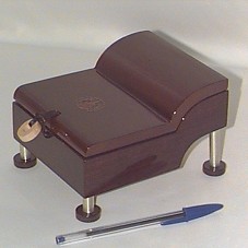 PORTA-JÓIA (12,6X15X9,8 CM) EM MADEIRA ENVERNIZADA COM PÉS EM AÇO FOSQUEADO. OBJETO LEMBRANDO O FORMATO DE PIANO. INTERIOR COM DUAS DIVISÕES FORRADO COM VELUDO PRETO. NA PARTE SUPERIOR DA TAMPA SÍMBOLO DA 'REPÚBLICA DE EL SALVADOR EM LA AMERICA CENTRAL' E INSCRIÇÃO. POSSUI FECHO EM FITA DE CETIM PRETO E DETALHE EM MADEIRA CLARA. ACOMPANHA CARTÃO DO REMETENTE 'CON UN ATENTO SALUDO DE ANA VILMA ALBANEZ DE ESCOBAR / VICEPRESIDENTA DE LA REPÚBLICA DE EL SALVADOR'. ACONDICIONADA EM CAIXA DE PAPELÃO BRANCA (16X21X10,5 CM).