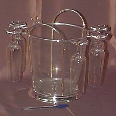 BALDE PARA CHAMPANHE (22X27 CM) EM VIDRO COM SUPORTE EM PRATA, REF. 599/A APOLO. NO SUPORTE LUGAR PARA COLOCAR SEIS TAÇAS. ACOMPANHA CINCO TAÇAS DE CHAMPANHE EM VIDRO. ACONDICIONADOS EM CAIXA DE PAPELÃO BRANCO COM INSCRIÇÃO DO FABRICANTE NA LATERAL (30X30X30 CM).