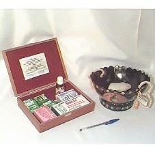 CESTA EM FORMA DE CUIA (21X11,5 CM) PINTADA NA COR PRETA COM DESENHOS DE TUCANOS, ARARAS, PEIXES E FLORES. NAS LATERAIS PEGADORES EM ARGOLA FEITOS DE PALHA. BASE COM A INSCRIÇÃO 'MANAUS - AMAZONAS - BRASIL - PELEFONNA'. ACOMPANHA INFORMATIVO 'BOMBONS FINOS DA AMAZÔNIA / SABORES EXÓTICOS'. CAIXA EM MADEIRA(22X17X6 CM) COM TAMPA MARCHETADA, CONTENDO UM SÊBO DE HOLANDA, UM SABONETE DE ANDIROBA, UM SABONETE DE COPAÍBA, QUATRO BANHAS PEIXE ELÉTRICO E UM ÓLEO ELÉTRICO. NO INTERIOR DA TAMPA, 'PRESIDENTE LULA, DESEJAMOS-LHE MUITA SAÚDE. ESTES UNGUENTOS DE ERVAS AMAZÔNICAS SÃO PARA ALIVIAR AS DORES DE SEU OMBRO. SAÚDE! / FUNCIONÁRIOS E PACIENTES DO HOSPITAL GERAL DR. GERALDO DA ROCHA / MANAUS - AMAZONAS / 2004'. NO FUNDO INTERNO DA CAIXA 'MADEIRAS AMAZÔNICAS / VIOLETA/CEDRO/MATUPÁ/GUARIÚBA / MANAUS - AMAZONAS / 2004'.