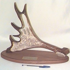 CHIFRE DE ALCE ESCULPIDO (36X27,5 CM). IMAGEM ESCULPIDA DE UM ALCE EM UMA FLORESTA. NO CANTO DIREITO, ASSINATURA 'D. CONNORS 03'. FIXADO EM BASE OVAL DE MADEIRA (38,5X14X2 CM). NA FRENTE DA BASE, PLACA (8X3 CM) EM METAL DOURADO, COM A GRAVAÇÃO 'PRESIDENTE LULA / UM LEMBRANÇA DO ALASKA / ADITÂNCIA DA AERONÁUTICA EM WASHINGTON / ANCHORAGE, 27 MAIO, 2004'.