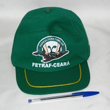 DOIS BONÉS IDÊNTICOS NA COR VERDE. NA FRENTE, A MARCA DA FETRAF (FEDERAÇÃO DOS TRABALHADORES DA AGRICULTURA FAMILIAR), COM A INSCRIÇÃO 'FETRAF-CEARÁ'. NAS LATERAIS O DESENHO DE UMA ESTRELA NA COR VERMELHA E A INSCRIÇÃO EM BRANCO 'PELA DEMOCRACIA / CONTRA O MONOPÓLIO' E ATRÁS 'REDE PÉ DURO / CREDNORTE / ACOOD'.