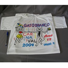 CAMISETA (TAM M) NA COR BRANCA. NA FRENTE AS INSCRIÇÕES 'GATO BRANCO / CARNAVAL 2004 / ANO 17 / SANHARÓ - PE', COM O DESENHO DE DOIS GATOS DANÇANDO. UM, COM UMA SAIA AMARELA, UMA SOMBRINHA NAS CORES AMARELA, AZUL E VERMELHA E UM CORAÇÃO VERMELHO NO PEITO E O OUTRO COM UMA GRAVATA PRETA E UM CHOPP NA MÃO. ATRÁS, AS INSCRIÇÕES 'CLUBE PISCINA / NOVA EXPEDIÇÃO / ZUM ZUUM CONFECÇÃO / CASA MONTEIRO/ MATERIAL E CONSTRUÇÃO / GRUPO IRMÃO VALENÇA/MATERIAL DE CONSTRUÇÃO E SUPERMERCADOS / CASA AVELINO ULTRAGÁS/ VOCÊ PRECISA DESSA SEGURANÇA / ARTHUR CONSÓRCIOS/OVERMELHÃO DA ECONOMIA/TUDO PARA SUA CASA / OS AMIGOS'.