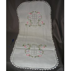 CAMINHO DE MESA (96X45 CM), NA COR BRANCA COM BORDADOS NAS LATERAIS. NOS CANTOS, FLORES NAS CORES AZUL, ROSA E BRANCA E RAMOS E FOLHAS NA COR VERDE, TAMBÉM BORDADOS.