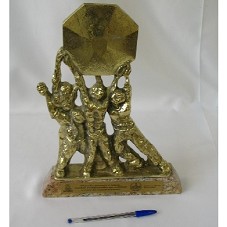 ESCULTURA (25X34,2 CM), EM METAL DOURADO, RETRATANDO HOMENS ERGUENDO UMA PLACA COMEMORATIVA. BASE EM MÁRMORE, TRAZENDO UMA PLACA DE METAL COM A MARCA DO SICREDI E AS INSCRIÇÕES 'PASSADO, PRESENTE E FUTURO... SONHOS TRANSFORMADOS EM REALIDADE ATRAVÉS DO COOPERATIVISMO / 100 ANOS/COOPERATIVISMO DE CRÉDITO/1902-2002 / SICREDI PIONEIRA 1902 - 2002/100 ANOS DE HISTÓRIA!'. NO FUNDO DA BASE 'NAKLE' COM O ENDEREÇO E TELEFONE.
