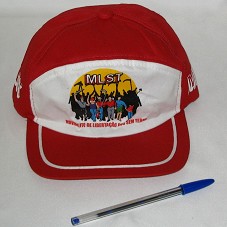 BONÉ NAS CORES VERMELHA E BRANCA. NA FRENTE , A MARCA DO MOVIMENTO DE LIBERTAÇÃO DOS SEM TERRA E NAS LATERAIS A SIGLA 'MLST'.