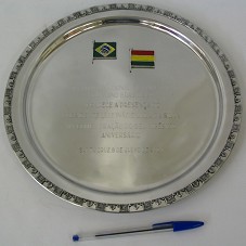 PRATO DECORATIVO (30,5 CM) EM METAL PRATEADO POLIDO. POSSUI, EM ALTO RELEVO, AS BANDEIRAS DO BRASIL E DA BOLÍVIA PINTADAS E A INSCRIÇÃO 'A CÂMARA NACIONAL DE COMÉRCIO BOLIVIANO BRASILEIRA AGRADECE A PRESENÇA DO PRESIDENTE LUIZ INÁCIO LULA DA SILVA NA COMEMORAÇÃO DO SEU VIGÉSIMO ANIVERSÁRIO / ANTO CRUZ , 8 DE JULHO DE 2004'. NAS BORDAS, FIGURAS DE EDIFÍCIOS E NO FUNDO UMA INSCRIÇÃO ILEGÍVEL DO FABRICANTE. ACONDICIONADA EM CAIXA DE VELUDO AZUL (32X32X3,5 CM).