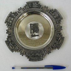 PRATO DECORATIVO (18,2 CM) EM METAL PRATEADO. TENDO A PARTE INTERIOR POLIDA, COM O DESENHO DE UM ÍNDIO BOLIVIANO E AS INSCRIÇÕES 'AO SR. PDTE: IGNACIO LULA DA SILVA / EN SU VISITA A BOLIVIA / SALUDA: LA CONFEDERACIÓN NAC. DE NACIONES INDIGENAS ORIGINARIAS DE BOLIVIA CONNIOB / INBERT ACOSTA G. / PRESIDENTE NACIONAL'. AS BORDAS FOSQUEADAS E TRABALHADAS COM DESENHOS DE HOMENS, MULHERES, CASAS E ANIMAIS. ATRÁS, TAMBÉM FOSQUEADO, POSSUI A INSCRIÇÃO 'TEL. CONIOB = 71519748 / CREACIONES ALEX'.
