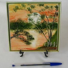 PINTURA EM AZULEJO (15,5X15,5 CM). RETRATA PAISAGEM NATURAL, COM ÁRVORES, O NASCER DO SOL E UMA CERCA DE MADEIRA. PREDOMINAM AS CORES VERDE, ROSA, AMARELO E BRANCO. ATRÁS, SUPORTE PARA PAREDE E DADOS COMPLETOS DO AUTOR. ACOMPANHA SUPORTE DE MESA EM PLÁSTICO PRETO E CARTÃO COM DADOS DO AUTOR. ACONDICIONADO COM ISOPOR, DENTRO DE CAIXA DE PLÁSTICO AZUL.