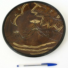 PRATO DECORATIVO (26,5 CM) NA COR MARROM. EM SEU INTERIOR DESENHOS DAS FACES DO SOL, DA LUA E DE UMA NUVEM SOPRANDO SOBRE MONTANHAS. NO FUNDO, A INSCRIÇÃO 'LUIZINHO - TRACUNHAÉM - PE'.