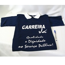 CAMISETA GOLA POLO (TAM G), NA COR AZUL MARINHO E A GOLA NA COR BRANCA, COM DOIS BOTÕES. NA FRENTE A INSCRIÇÃO 'CARREIRA JÁ / QUALIDADE E DIGNIDADE NO SERVIÇO PÚBLICO' E ATRÁS 'GREVE PELO CUMPRIMENTO DO ACORDO / FASUBRA/CUT/CEA/SINDICAL'.