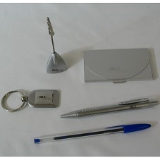 UM KIT PARA ESCRITÓRIO, CONTENDO UMA CANETA, UM PORTA-CARTÃO , UM PRENDEDOR DE PAPEL E UM CHAVEIRO, TODOS NA COR CINZA E COM A INSCRIÇÃO 'EBRG FURNAS / 40 ANOS'. ACOMPANHA UM CARTÃO ASSINADO PELO GERENTE DO ERB.I, SENHOR JOSÉ VICENTE FORTINI E UM CARTÃO DE VISITAS. ACONDICIONADO EM UMA CAIXA (16,5X14,5X3,5 CM) NA COR PRETA.
