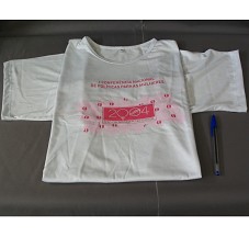 CAMISETA (TAM G), NA COR BRANCA. NA FRENTE A INSCRIÇÃO 'I CONFERÊNCIA NACIONAL DE POLÍTICAS PARA AS MULHERES' E A LOGOMARCA DO ANO DA MULHER NO BRASIL, TODOS NA COR ROSA. ATRÁS, TAMBÉM NA COR ROSA, OS PATROCINADORES DO EVENTO.