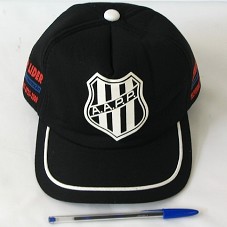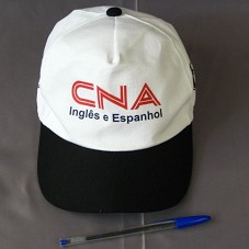 BONÉ NA COR BRANCA E PRETA. NA FRENTE E ATRÁS A INSCRIÇÃO 'CNA / INGLÊS E ESPANHOL' E NAS LATERAIS O SÍMBOLO DO CLUBE DE FUTEBOL PONTE PRETA - A.A.P.P. - ASSOCIAÇÃO ATLÉTICA PONTE PRETA.