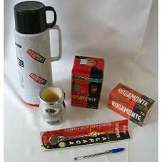 DUAS GARRAFAS TÉRMICAS ( 1 LITRO), NA COR CINZA E A MARCA 'ROSAMONTE', COM A TAMPA PRETA; DUAS CUIAS DE ALUMÍNIO; DUAS BOMBILHAS EM METAL PRATEADO E DOURADO, COM A MARCA 'ROSAMONTE'; DOIS PACOTES (500 GRAMAS), FECHADOS, DE ERVA MATE E DOIS PACOTES FECHADOS, CONTENDO 25 SAQUINHOS (2 GRAMAS) DE CHÁ MATE, TODOS DA MARCA 'ROSAMONTE'. ACONDICIONADOS EM CAIXA DE MADEIRA (26,5X12,5X37,5 CM),COM TAMPO DE ACRÍLICO. ACOMPANHA CARTÃO DE VISITA DO GOVERNADOR DA PROVÍNCIA DE MISIONES, SENHOR CARLOS EDUARDO ROVIRA E FOLHETO EXPLICATIVO DA ROSAMONTE PARA O PREPARO DO MATE.