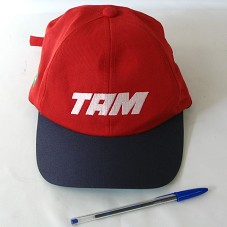 BONÉ NAS CORES VERMELHA, AZUL E VERDE. NA FRENTE, BORDADO A INSCRIÇÃO 'TAM', E NAS LATERAIS A BANDEIRA NACIONAL.