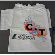 CAMISETA (TAM GG) EM MALHA BRANCA, DE MANGA CURTA. NA FRENTE, ESTAMPAS DE UMAS MOLÉCULAS E 'C&T'; E, AINDA, 'FIOCRUZ: CIÊNCIA E TECNOLOGIA / ASSIM SE FAZ O FUTURO'.