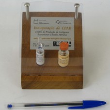 PLACA (7X5,5 CM) EM METAL PRATEADO, COM A INSCRIÇÃO 'INAUGURAÇÃO DO CPAB / CENTRO DE PRODUÇÃO DE ANTÍGENOS BACTERIANOS CHARLES MÉRIEUX / VACINA CONJUGADA CONTRA HAEMOPHILUS INFLUENZAE TIPO B / RIO DE JANEIRO, 5 DE AGOSTO DE 2004'. POSSUI LOGOMARCA DA FIOCRUZ, DO INSTITUTO BIO-MANGUINHOS E DO GOVERNO FEDERAL. FIXADA EM BASE TRAPEZOIDAL DE MADEIRA (9,5X10X2,5X7,5 CM), COM DUAS AMPOLAS DE VACINA FIXAS A ELA, E COM UMA PROTEÇÃO DE ACETATO. ACONDICIONADA EM CAIXA DE PAPELÃO (10,5X10,5X11 CM), COM SÍMBOLOS DAS INSTITUIÇÕES NA FRENTE.