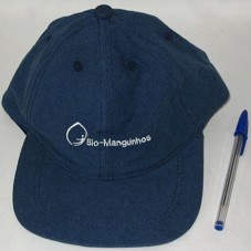 BONÉ EM BRIM AZUL. NA FRENTE, BORDADO EM BRANCO, 'BIO-MANGUINHOS' E SÍMBOLO, UMA GOTA COM FIGURA HUMANA ESTILIZADA.