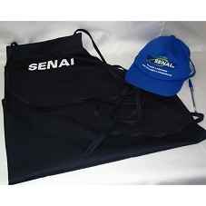 AVENTAL (TAM P), NA COR AZUL ESCURO. POSSUI NA FRENTE A INSCRIÇÃO 'SENAI', BORDADO NA COR BRANCA E UM BOLSO. UM BONÉ, NA COR AZUL. NA FRENTE AS INSCRIÇÕES '2004/SENAISC/1954 / INOVANDO A EDUCAÇÃO COM TECNOLOGIA E COMPETÊNCIA', NAS LATERAIS AS INSCRIÇÕES 'CURSOS TÉCNICOS / ENSINOS MÉDIO / SUPERIORES DE TECNOLOGIA / PÓS GRADUAÇÃO' E 'FIESC/CIESC/SESI/SENAI/IEL / SISTEMA FEDERAÇÃO DAS INDÚSTRIAS DO ESTADO DE SANTA CATARINA'.