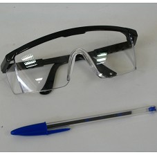 ÓCULOS PROTETOR, COM LENTE EM PLÁSTICO TRANSPARENTE E ARMAÇÃO EM PLÁSTICO PRETO. POSSUI PERNAS REGULÁVEIS.