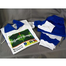 CONJUNTO DE MOLETON (TAM M) EM ELANCA, COMPOSTO POR CASACO BRANCO COM DETALHES AZUIS, E CALÇA AZUL COM DETALHES BRANCOS. NO CASACO, ESTAMPA EM TONS DE VERDE, DESENHO DE UM CAMPO DE FUTEBOL DIVIDIDO POR DOIS LÁPIS, E 'SEGUNDO TEMPO / MINISTÉRIO DO ESPORTE / BRASIL UM PAÍS DE TODOS / GOVERNO FEDERAL'. ATRÁS, SÍMBOLO DO FOME ZERO.