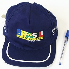 BONÉ EM BRIM AZUL, COM DETALHE BRANCO NA ABA. NA FRENTE, BORDADO COM LOGOMARCA DO GOVERNO FEDERAL 'BRASIL UM PAÍS DE TODOS'. NAS LATERAIS, 'MINISTÉRIO DO ESPORTE'; ATRÁS, 'BRASIL'.