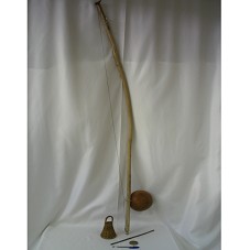 BERIMBAU (150 CM) ACOMPANHADO DE CHOCALHO DE FORMATO TRIANGULAR, FEITO DE VIME, UMA BAQUETA DE MADEIRA E UM PEDAÇO CIRCULAR EM METAL DOURADO.
