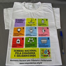 CAMISETA (TAM G), NA COR BRANCA. NA FRENTE, QUADRINHOS COM AS INSCRIÇÕES '8 JEITOS DE MUDAR O MUNDO / 1 ACABAR COM A FOME E A MISÉRIA / 2 EDUCAÇÃO BÁSICA DE QUALIDADE PARA TODOS / 3 IGUALDADE ENTRE SEXOS E VALORIZAÇÃO DA MULHER / 4 REDUZIR A MORTALIDADE INFANTIL / 5 MELHORAR A SAÚDE DAS GESTANTES / 6 COMBATER A AIDS, A MALÁRIA E OUTRAS DOENÇAS / 7 QUALIDADE DE VIDA E RESPEITO AO MEIO AMBIENTE / 8 TODO MUNDO TRABALHANDO PELO DESENVOLVIMENTO / SEMANA NACIONAL PELA CIDADANIA E SOLIDARIEDADE / NÓS PODEMOS / MOVIMENTO NACIONAL PELA CIDADANIA E SOLIDARIEDADE / WWW.NOSPODEMOS.ORG.BR'. ATRÁS 'COEP / REDE NACIONAL DE MOBILIZAÇÃO SOCIAL / V SEMANA NACIONAL DE MOBILIZAÇÃO PELA VIDA / IMAGINE O QUE PODE REALIZAR A FORÇA DE UM MULTIPLICADA POR MILHÕES / WWW.COEPBRASIL.ORG.BR'.