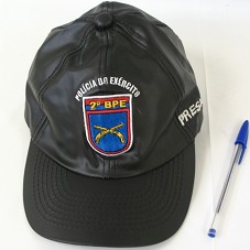 BONÉ DE NAPA, NA COR PRETA. NA FRENTE, BORDADO O SÍMBOLO DA POLÍCIA DO EXÉRCITO E NA LATERAL ESQUERDA A INSCRIÇÃO 'PRESIDENTE LULA'.
