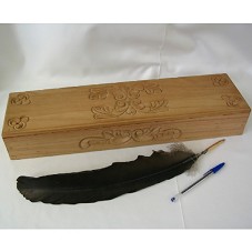 CANETA ESFEROGRÁFICA COM CORPO EM METAL DOURADO (8 CM), TENDO, NA EXTREMIDADE, PENA DE UM CONDOR (40 CM). ACONDICIONADA EM CAIXA DE MADEIRA (52,5X13,5X8,5 CM) COM ENTALHES EM ARABESCOS, NA TAMPA E NAS LATERAIS. NO INTERIOR DELA, 'PRESIDENTE LUIS INÁCIO LULA DA SILVA / PIEDRA FUNDAMENTAL DE LA INTEGRACIÓN AMERICANA / ASSIS - BRASIL 2004 / MATEO SALINAS LOVON / CAMARA DE COMERCIO, INDUSTR. TURISMO / MADRE DE DIOS - PERU'. ACOMPANHA FOLHETO SOBRE EXPOSIÇÃO DE PINTURAS DE CARLOS HURTADO GÁLVEZ, EM ESPANHOL, COM DESENHO DE UM ÍNDIO NO LADO ESQUERDO.