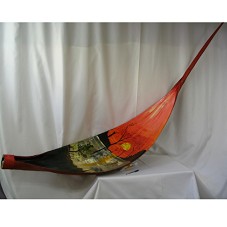 PINTURA EM FOLHA (205 CM, APROXIMADAMENTE) DE ÁRVORE, RETRATANDO PÔR-DO-SOL NUM RIO, COM VEGETAÇÕES SECAS E ROBUSTAS. PREDOMINA OS TONS DE VERMELHO E PRETO. NO CANTO CENTRAL DIREITO, 'OSMAR SANTOS'. UMA DAS PONTAS ESTÁ AMARRADA COM BARBANTE PINTADO DE VERMELHO.