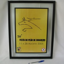 QUADRO (41,5X54 CM), CONTENDO O CARTAZ DA 50ª FESTA DO PEÃO DE BOIADEIRO, EMOLDURADO EM VIDRO E MADEIRA NA COR PRETA.POSSUI O DESENHO DE UM PEÃO MONTADO EM UM CAVALO E A INSCRIÇÃO '50º FESTA DO PEÃO DE BOIADEIRO / 11 A 28 AGOSTO 2005 / OBRA: OSCAR NIEMEYER'.
