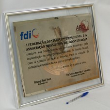 PLACA (40X28 CM) EM METAL PRATEADO, COM BORDAS POLIDAS E SÍMBOLO DA REPÚBLICA FEDERATIVA DO BRASIL, EM MARCA D'ÁGUA, NO CENTRO. POSSUI A INSCRIÇÃO 'A FEDERAÇÃO DENTARIA INTERNACIONAL E A ASSOCIAÇÃO BRASILEIRA DE ODONTOLOGIA PRESTAM SUA HOMENAGEM AO GOVERNO BRASILEIRO PELA IMPLANTAÇÃO DE UMA POLITICA NACIONAL DE SAÚDE BUCAL, COM A CERTEZA DE QUE A MESMA TRARÁ O RESGATE DA CIDADANIA EM SAÚDE BUCAL PARA O POVO BRASILEIRO. BRASILIA, 15 DE JULHO DE 2004 / HEUNG-RYUL YOON PRESIDENTE FDI / NORBERTO FRANCISCO LUBIANA PRESIDENTE NAC. DA ABO'. FIXADA EM MOLDURA DE VIDRO COM ACABAMENTO EM METAL PRATEADO (45,5X35,5CM).
