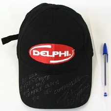 BONÉ EM BRIM PRETO. NA FRENTE, BORDADO EM VERMELHO E BRANCO, 'DELPHI'. NA ABA, INSCRIÇÃO, 'AO LULA, O PRESIDENTE QUE O PAÍS SEMPRE QUIS! DO SEU COMPANHEIRO ....' (ASSINATURA ILEGÍVEL).