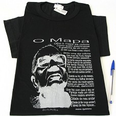 CAMISETA (TAM GG), EM MALHA PRETA, DE MANGA CURTA. NA FRENTE, ESTAMPADO O ROSTO DE MÁRIO QUINTANA E O POEMA 'O MAPA / OLHO O MAPA DA CIDADE / COMO QUEM EXAMINASSE / A ANATOMIA DE UM CORPO.../ (É NEM QUE FOSSE O MEU CORPO!) / ... / HÁ TANTA MOÇA BONITA / NAS RUAS QUE NÃO ANDEI / (E HÁ UMA RUA ENCANTADA /QUE NEM EM SONHOS SONHEI...) / ... / MÁRIO QUINTANA'. POSSUI UMA ETIQUETA COM A INSCRIÇÃO 'SERIAÇÃO / SERVIÇOS SERIGRÁFICOS'.