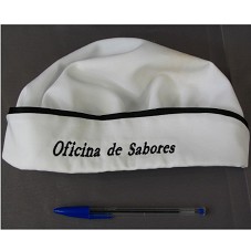 TOUCA NA COR BRANCA, COM AS BORDAS DA PALA NA COR PRETA. POSSUI A INSCRIÇÃO 'OFICINA DE SABORES', BORDADO NA COR PRETA.