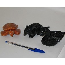 TRÊS OBJETOS DE DECORAÇÃO ESCULPIDOS EM PEDRA, EM FORMA DE ANIMAIS, SENDO UMA TARTARUGA MARINHA (12X8X4 CM), NA COR LARANJA, UM TATU (11,5X3,84,5 CM), NA COR PRETA E UM CISNE (8,5X4,5X7 CM), TAMBÉM NA COR PRETA.