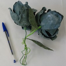 FLORES DECORATIVAS, COM AS PÉTALAS E FOLHAS FEITAS COM PAPÉIS NA COR VERDE E OS TALOS COM ARAMES FORRADOS COM PAPEL, TAMBÉM VERDE. POSSUI UM CARTÃO DE VISITA, COM A INSCRIÇÃO 'VILA DAS FLORES / FLORES DE PAPEL, TECIDO E SABONETE PARA TODAS AS OCASIÕES. / END: RUA ORIENTAL, 426, SÃO LUCAS BH/MG / TELEFONES: 3282-0378/9642-0378 / TRATAR COM TIANA / 30240-320' E ATRÁS 'SEJA UM PRESIDENTE SOLIDÁRIO / TIANA'.