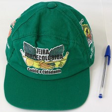 BONÉ EM BRIM VERDE. NA FRENTE A INSCRIÇÃO 'FEIRA AGROECOLÓGICA / SAÚDE E CIDADANIA' E DESENHOS DE VERDURAS E HORTALIÇAS. NAS LATERAIS 'APOIO: BANCO DO NORDESTE / CÁRITAS ARQUID.DA PB' E 'APOIO: MAND.POPULAR DEP.FREI ANASTÁCIO'.