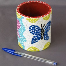 PORTA LÁPIS (9X10,5 CM) COM ACABAMENTO EM MOSAICO DE FIGURAS DE BORBOLETAS, NAS CORES AZUL, VERDE, VERMELHO, ROSA, AMARELO E BRANCO. INTERIOR PINTADO EM VERMELHO.