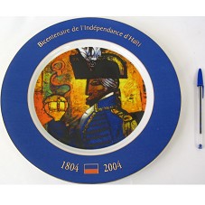 PRATO COMEMORATIVO (31 CM) AO BICENTENÁRIO DA INDEPENDÊNCIA DO HAITI. PRATO EM PORCELANA BRANCA, COM INSCRIÇÕES EM DOURADO, 'BICENTENAIRE DE L'INDÉPENDANCE D'HAITI / 1804 - 2004'; BORDA AZUL COM FILETES DOURADOS; E NO CENTRO, PINTURA DE UM HOMEM VESTIDO COM UNIFORME MILITAR FRANCÊS DO SÉCULO XIX. NO CANTO INFERIOR DIREITO, ASSINATURA DO ARTISTA, 'DODARD 94'. ATRÁS, 'OEUVRE ORIGINALE DE DODARD / REPRODUCTION AUTORISÉE / ASSIETTE COMMÉMORTIVE DU BICENTENAIRE DE L'INDÉPENDANCE D'HAITI'. ACONDICIONADO EM CAIXA DE PAPELÃO BRANCO (31X31X4 CM) COM A INSCRIÇÃO 'EDITIONS CERAMIQUES' NA FRENTE.