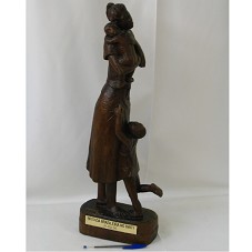 ESCULTURA EM MADEIRA (57 CM) DE UMA MULHER SEGURANDO UMA CRIANÇA NO COLO, ENQUANTO OUTRA CRIANÇA ABRAÇA SUAS PERNAS. POSSUI PLACA (13,5X2,5 CM) COM A INSCRIÇÃO 'BRIGADA BRASILEIRA NO HAITI / 18 AGO 04'. NA CANTO ESQUERDO DA BASE POSSUI, 'DELVA / HAITI'; E NO FUNDO, 'DELVA 2004'.