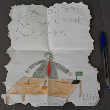 DESENHO EM PAPEL, COM RECORTES NAS LATERAIS (20X28 CM) DO PRESIDENTE LULA,TRAJANDO TERNO PRETO E GRAVATA VERMELHA, SENTADO À MESA, COM MICROFONE E A BANDEIRA NACIONAL. POSSUI A INSCRIÇÃO 'LULA: OBRIGADO POR SER UM BOM PRESIDENTE. / AGOSTO 2004 / LUÃ (7 ANOS)'.