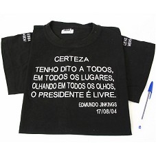 CAMISETA (TAM GG) EM MALHA PRETA, DE MANGA CURTA. NA FRENTE, BORDADO EM BRANCO, 'CERTEZA / TENHO DITO A TODOS, EM TODOS OS LUGARES, OLHANDO EM TODOS OS OLHOS, O PRESIDENTE É LIVRE. EDMUNDO JINKINGS 17/08/04'. NAS MANGAS, 'LEVE ESSA MENSAGEM!'.