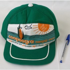 BONÉ EM BRIM VERDE. NA FRENTE, ESTAMPA COM MILHARAL, UM PÁSSARO E SOL. POSSUI A INSCRIÇÃO 'COOPEAGRO / MARAGOGI-ALAGOAS / COOPERATIVA DOS PEQUENOS AGRICULTORES ORGANIZADOS / UNIÃO LUTA AÇÃO'.